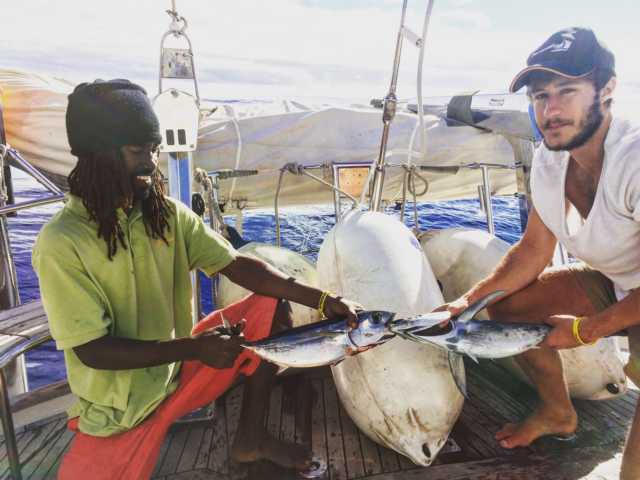 heute umgesetzt. Ich habe mir einen Kampf mit einem Blue Marlin bzw Schwertfisch geliefert und ihn schlussendlich gefangen. Da brennen die Arme ;) Nachdem wir ihn dann gegessen hatten, haben ich und Simon einen Fischtanz an Deck aufgefuehrt. Es dauerte dann ca 30min und das Unglaubliche passierte. Wir hatten ploetzlich ZWEI Thunfische zur selben Zeit an beiden Angeln. Da soll mal einer sagen wir koennten nicht tanzen. Einen zog Simon an Deck den andern Ean. Da wir aber alle noch satt sind gibts die Fische morgen. Grad ist es 17:45 also noch Zeit fuer ein weiteres Ereignis.