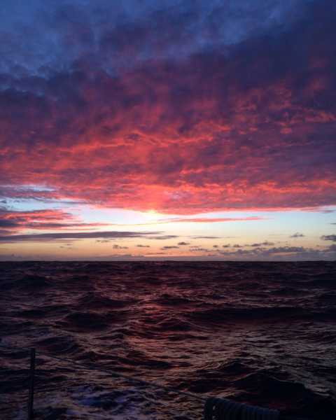 M: Meine Schicht begann um 3, wurde aber schon um 2 geweckt, da ich aufgrund der Halse von der einen Seite des Bettes auf die andere gerollt wurde und mit dem Kopf gegen die Wand knallte. Trotz nur knapp 3 Stunden schlaf war ich hellwach und hatte eine schoene Morgenschicht. Nicht zu kalt und ein schoener Sonneraufgang. Dann legte ich mich bis es Essen gab nochmal schlafen. Nach einer Selleriesuppe begann meine naechste Sichte. Zuerst sah alles gut aus, doch dann zogen dunkle Wolken am Horizont auf. Der Wind drehte und somit auch unser Kurs (von 70° auf 25°). Bisschen regnete es noch und dann war auch schon wieder alles vorbei. Nur der schlechte Kurs blieb, sodass Mark und ich schlussendlich den Motor anmachten. Jetzt segeln wir zwar nicht mehr, aber immerhin geht es nun mit guter Geschwindigkeit in die richtige Richtung und nicht im Zickzack in die Falsche. Ich hab jetzt aber erstmal 6 Stunden Pause -> lesen denn Simon stresst zu spoilern (Arsch)