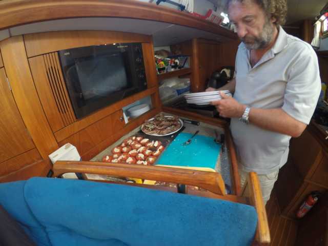 Jetzt stehen wir gerade zu viert in der Kueche und bereiten das Abendessen vor. Maxi schnippelt Knoblauch und Zwiebeln, Ean macht das Dressing, Klaus kocht die Nudeln und ich wasche und zerkleinere den Salat und verfeinere das Pesto. Dazu gibts kalten Sangria bzw. Roséwein. Danach wollte ich noch etwas schlafen bis ich Schicht hatte, aber irgendwie konnte ich nicht einschlafen. Also sitze ich mit Ean an Deck und halte Wache mit ihm, da Klaus schlaeft. Es ist 23:20 und der Himmel ist immernoch orange und es ist unglaublich idyllisch. 60 Meilen bis Camaret. Morgen frueh um 09:00 ca. sollten wir da sein.