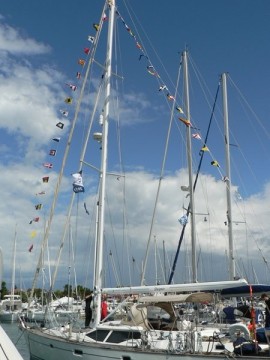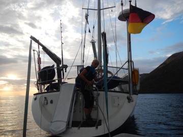 neben uns ein deutsches Boot, halb so lang wie unseres, mit einem jungen Mann an Bord. Er ist schon seit 2 Monaten unterwegs, kommt aus Kiel